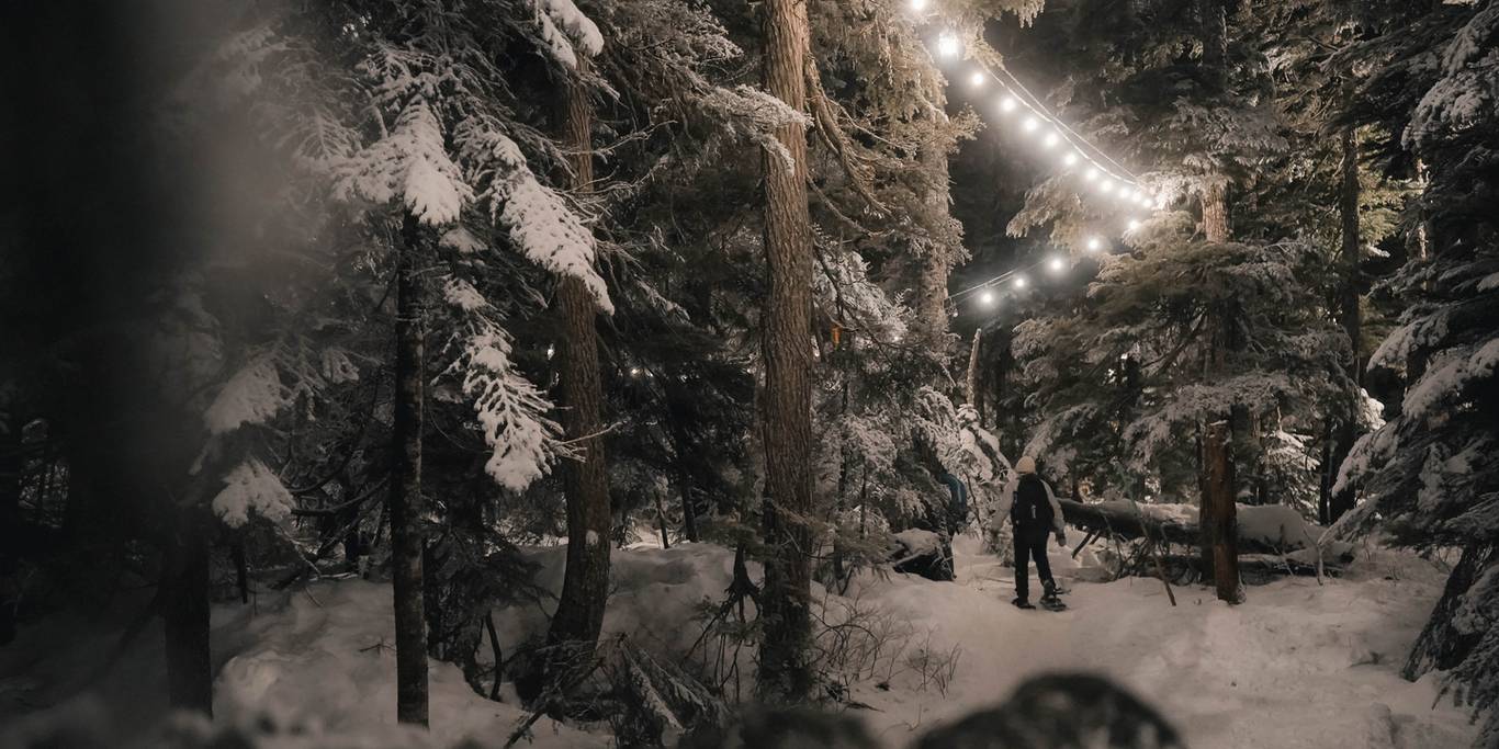 A safe and easy one-kilometre snowshoe trek to the historic Hollyburn Lodge along a self-guided trail through the enchanting Old Growth Forest. The trail is lit with LED lights strung sustainably through the forest boughs of ancient Cedar, Fir and Hemlock trees.